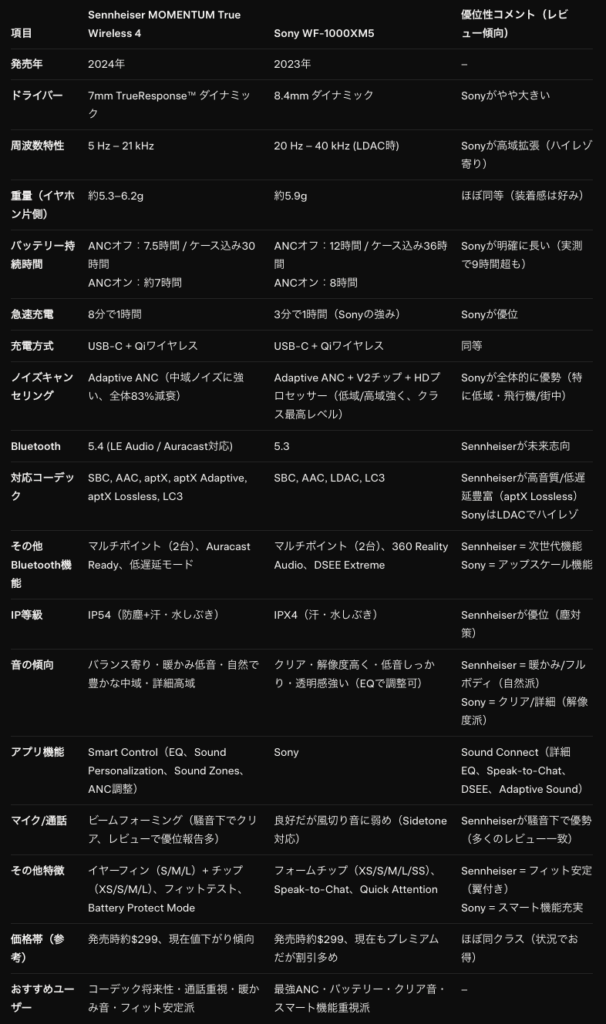 機能もほぼイーブンってとこですか。ソニーはノイズキャンセリングが強くて定評がありますね。